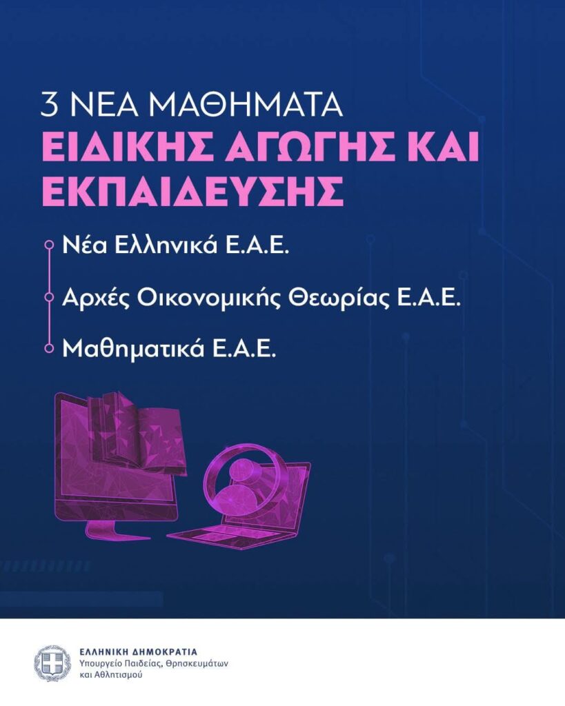 Ιδιαίτερη σημασία έχει και η στήριξη των μαθητών με ειδικές εκπαιδευτικές ανάγκες, καθώς προστίθενται 3 νέα μαθήματα Ειδικής Αγωγής στην ασύγχρονη μορφή του προγράμματος. Έτσι, η εκπαιδευτική πολιτική αποκτά ανθρωποκεντρικό χαρακτήρα, δίνοντας ίσες δυνατότητες μάθησης και ανάπτυξης σε κάθε παιδί.