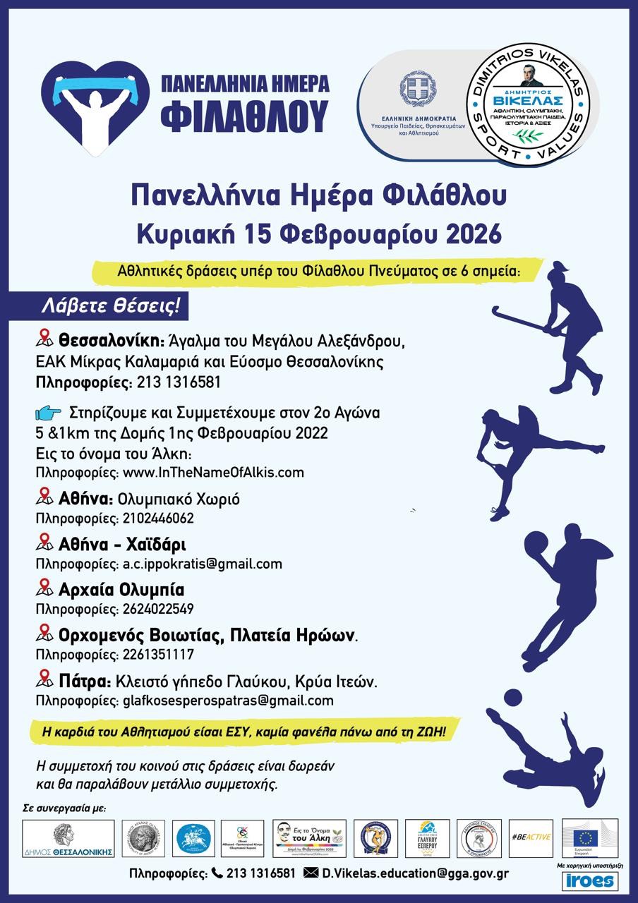 Με σύνθημα «Η καρδιά του Αθλητισμού είσαι ΕΣΥ, καμία φανέλα πάνω από τη ΖΩΗ!», η Πανελλήνια Ημέρα Φιλάθλου θα τιμηθεί την Κυριακή 15 Φεβρουαρίου 2026 με σειρά αθλητικών δράσεων σε έξι σημεία της χώρας, προωθώντας το φίλαθλο πνεύμα, τον σεβασμό και τις αξίες του αθλητισμού.